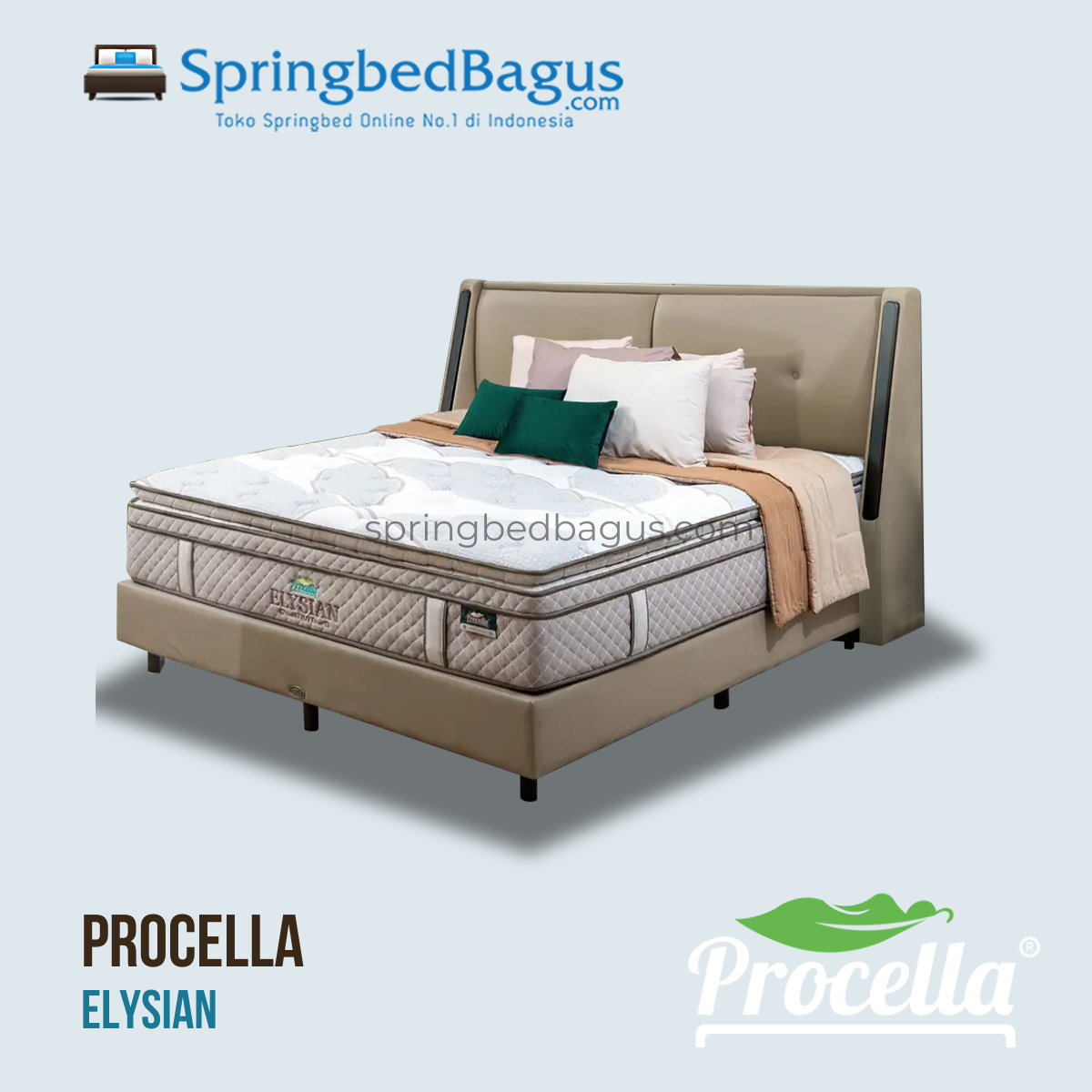 Procella Elysian Springbed – Medium Soft yang nyaman dan responsif. Dirancang dengan Motion Isolation Pocket Coil, Cloud-Feel Pillow Top, Memory Foam, Latex, dan kain lembut. Dilengkapi Pro-Guard Encasement serta garansi pegas 20 tahun—untuk tidur tenang setiap malam.