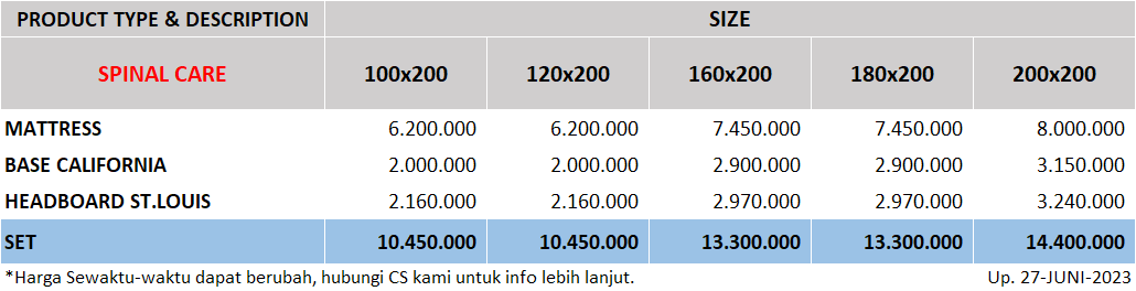 | Ukuran | 100×200, 120×200, 160×200, 180×200, 200×200 |